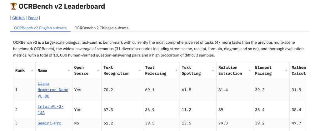 训练过程中,英伟达采用了自家的Megatron-LLM框架和Energon数据加载器,依托强大的A100和H100 GPU集群完成。在OCRBench v2基准测试中,Llama Nemotron Nano VL在OCR、表格解析和图表推理等任务上展现了领先精度,尤其在结构化数据提取(如表格和键值对)及布局相关问题解答中,表现尤为突出,甚至媲美更大规模的模型。